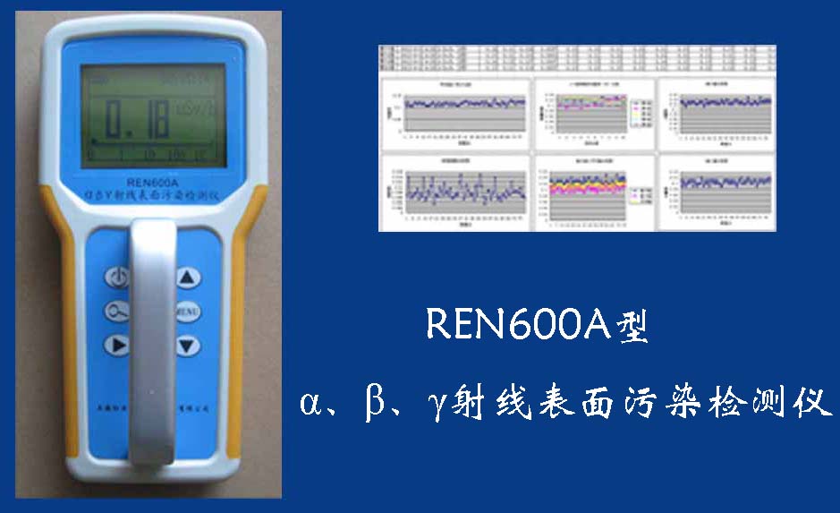 REN600A型α、β、γ射線表面污染檢測儀即可檢測α、β、γ射線,也能檢測到X射線,它采用高速嵌入式微處器作為數(shù)據(jù)處理單元,點陣式大屏幕LCD液晶顯示,讀數(shù)清晰、操作方便,具有400條超大容量數(shù)據(jù)存儲。儀器采用進口的大面積MICA蓋革探測器,具有較高探測效率,可進行α、β輻射表面污染檢測和X、γ輻射劑量率的監(jiān)測。此外通過配套的RenriCont表面污染管理軟件可將存儲的數(shù)據(jù)讀出后分析?蓮V泛用在制藥廠、實驗室、發(fā)電廠、進出口商檢、采石場、環(huán)境實驗室、環(huán)境污染調(diào)查、核安全應(yīng)急、緊急狀況營救站、金屬處理廠、地下油田、供油管道裝備、醫(yī)院核醫(yī)學(xué)科、同位素實驗室、環(huán)境保護和警察局等部門。REN600A型α、β、γ射線表面